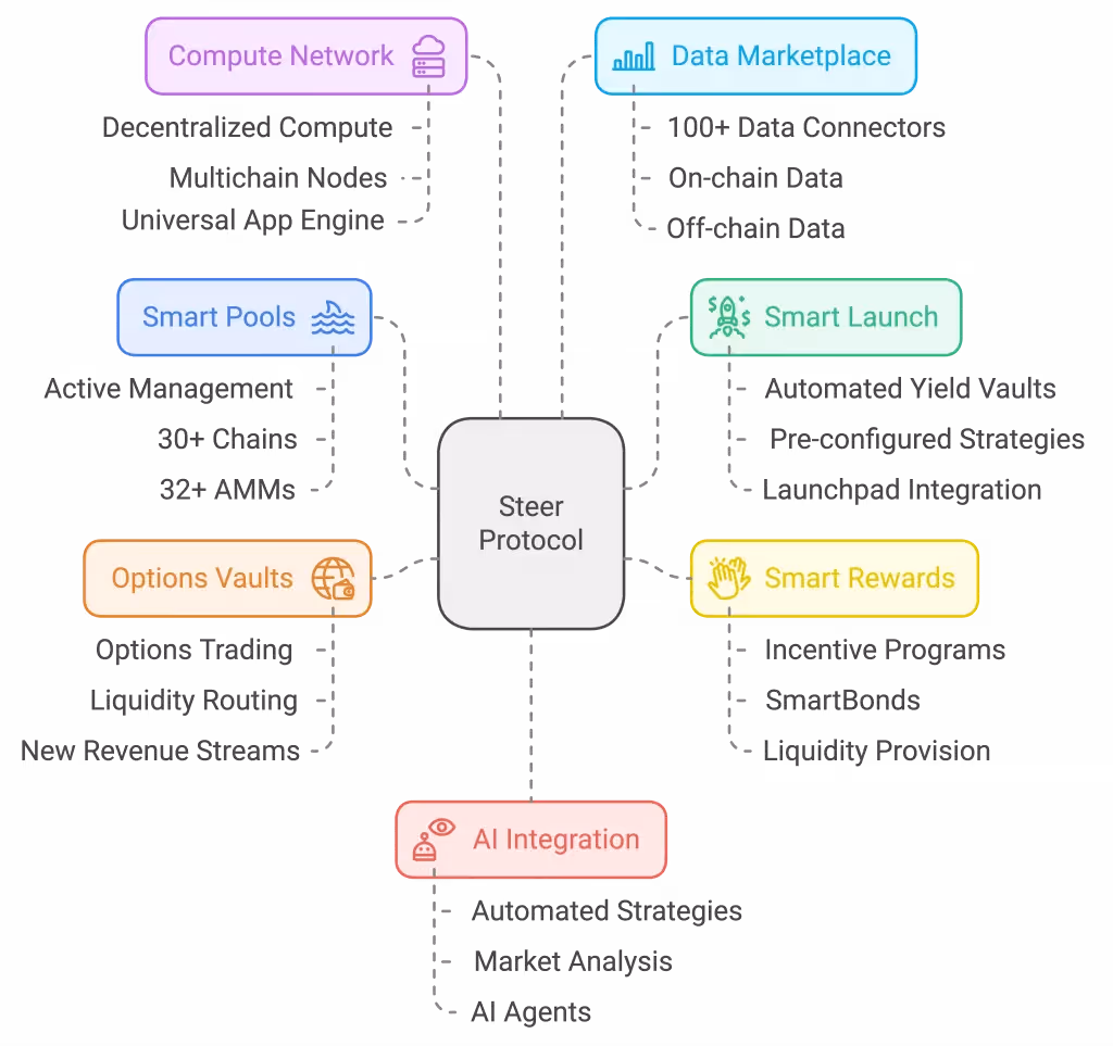 Steer Protocol introduces a unified DeFi infrastructure that integrates off-chain computation, multi-position liquidity strategies, and real-world data connectors. This ecosystem empowers developers and protocols to build scalable, automated Web3 applications with enhanced capital efficiency.