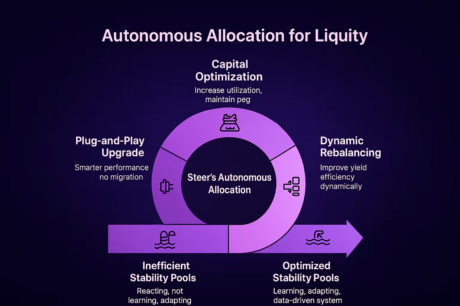 - Autonomous allocation: Dynamically rebalances across stability pools to improve yield efficiency.