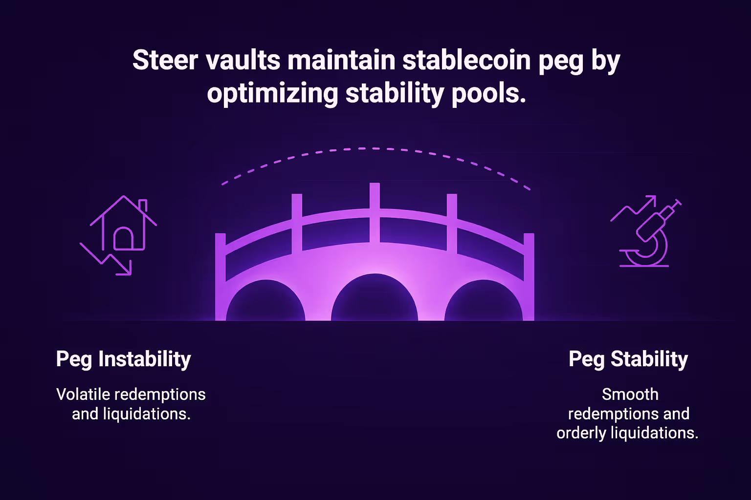 Steer vaults keep liquidity parked in the stability pools that are used to liquidate troves and process redemptions, so there’s always capital available when the peg is stressed. - Smooths redemptions and price moves: