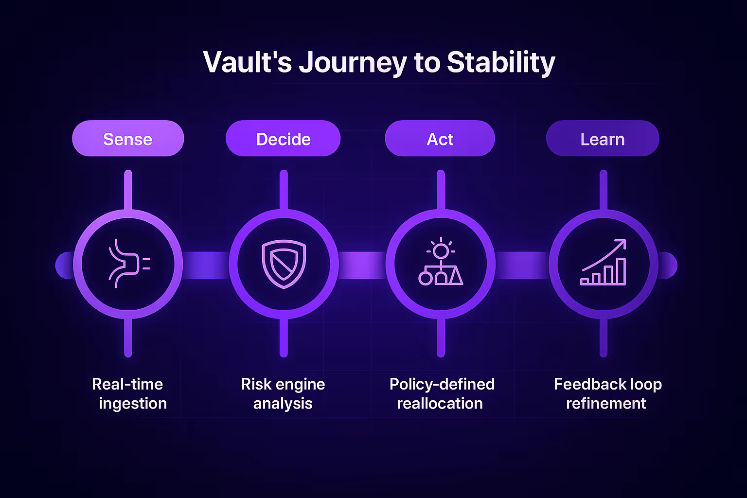 The vault reallocates collateral and debt within policy-defined bounds. All actions are throttled and executed non-custodially via smart contracts.