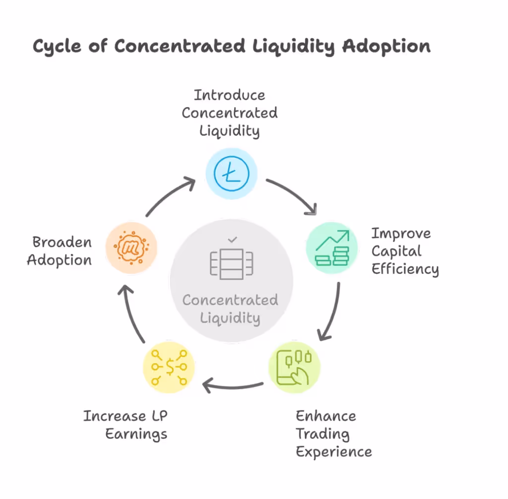 Not long ago, most AMMs (like Uniswap v2) required LPs to spread liquidity across the entire price spectrum, which was highly inefficient. The introduction of Uniswap v3 in 2021 changed the game by letting LPs concentrate liquidity in specific price ranges. This CLAMM model has quickly caught on across the DeFi landscape: